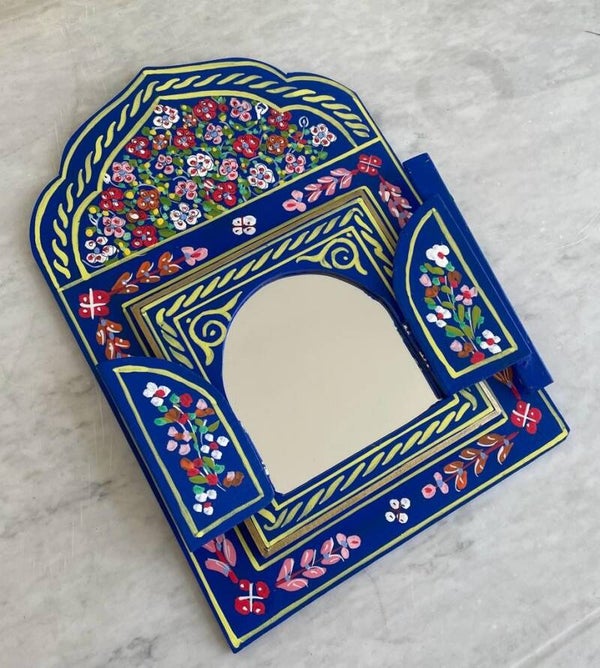 De beschilderde spiegels zijn met de handgemaakt en beschilderd in Marokko. De luikjes kun je openen en sluiten. Je kunt deze schattige plekjes overal in huis ophangen of neerzetten. Denk aan je gang, slaapkamer, woonkamer, hal en zelfs in het toilet is het een ware eye catcher!